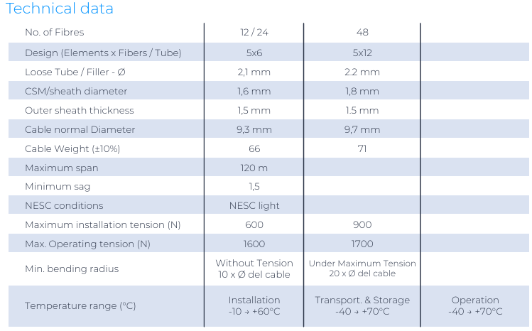- Cubierta exterior: HDPE (polietileno de alta densidad), con 1 cuerda de rasgado (ripcord) debajo.