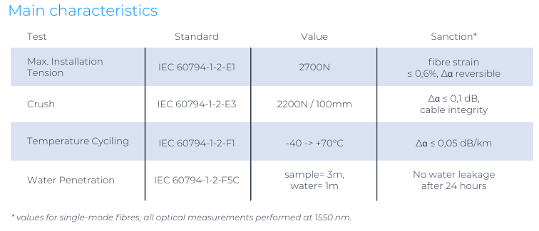 - material termoplástico que contiene 12 fibras ópticas y está relleno con un compuesto adecuado para la estanqueidad al agua.